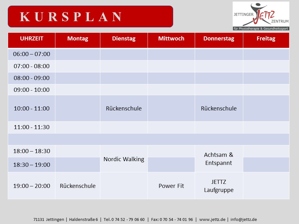 Willkommen bei Ihrem JETTZ-Kursangebot! Ob drinnen oder draußen an der frischen Luft, gemeinsam in der Gruppe, macht Training riesig Spaß. Sie haben weitere Fragen zu den Kursinhalten? Kein Problem, sprechen Sie uns einfach an.